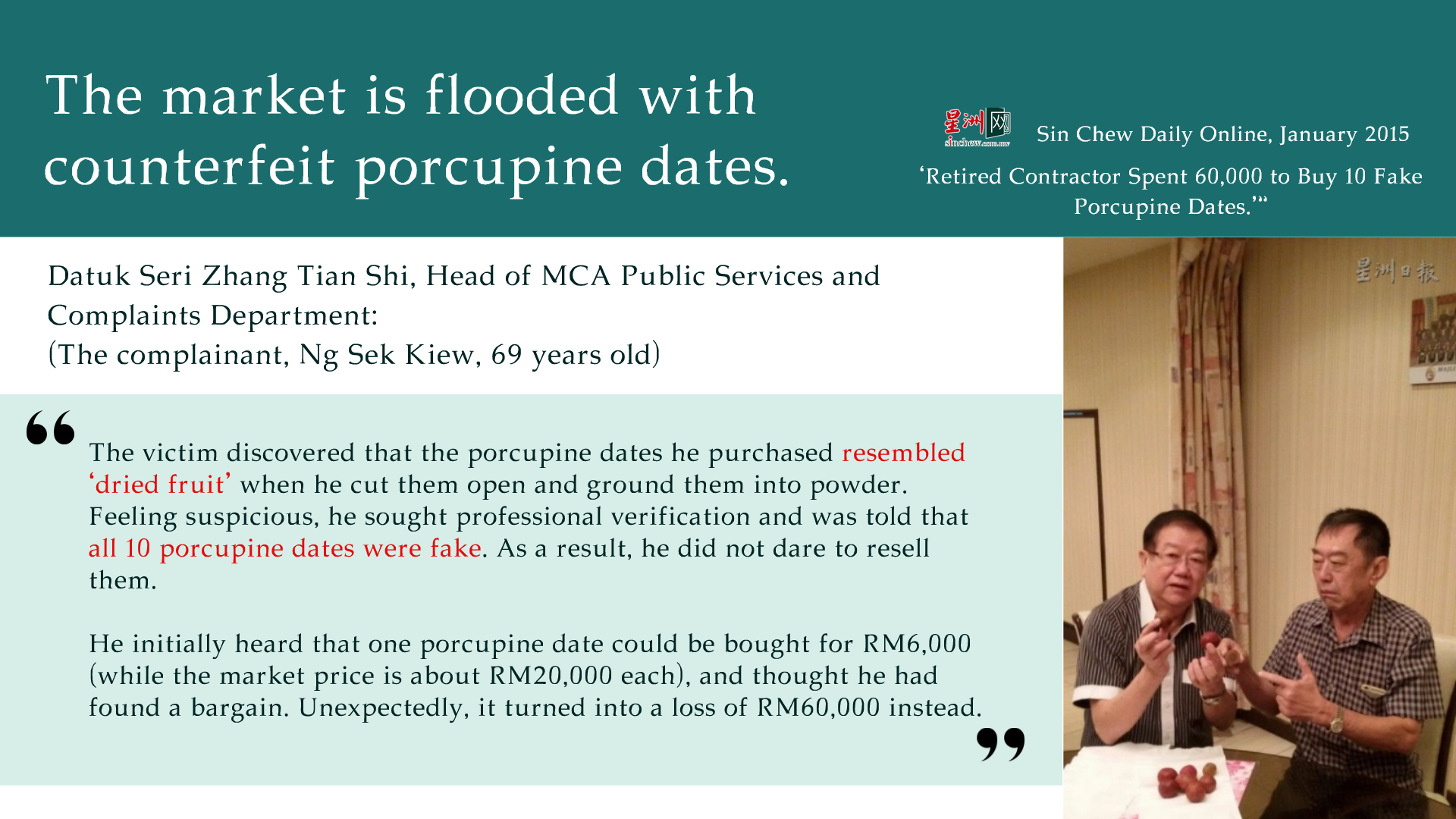 - Sin Chew Daily “Retired Contractor Spends RM60,000 on 10 Fake Porcupine Bezoars”